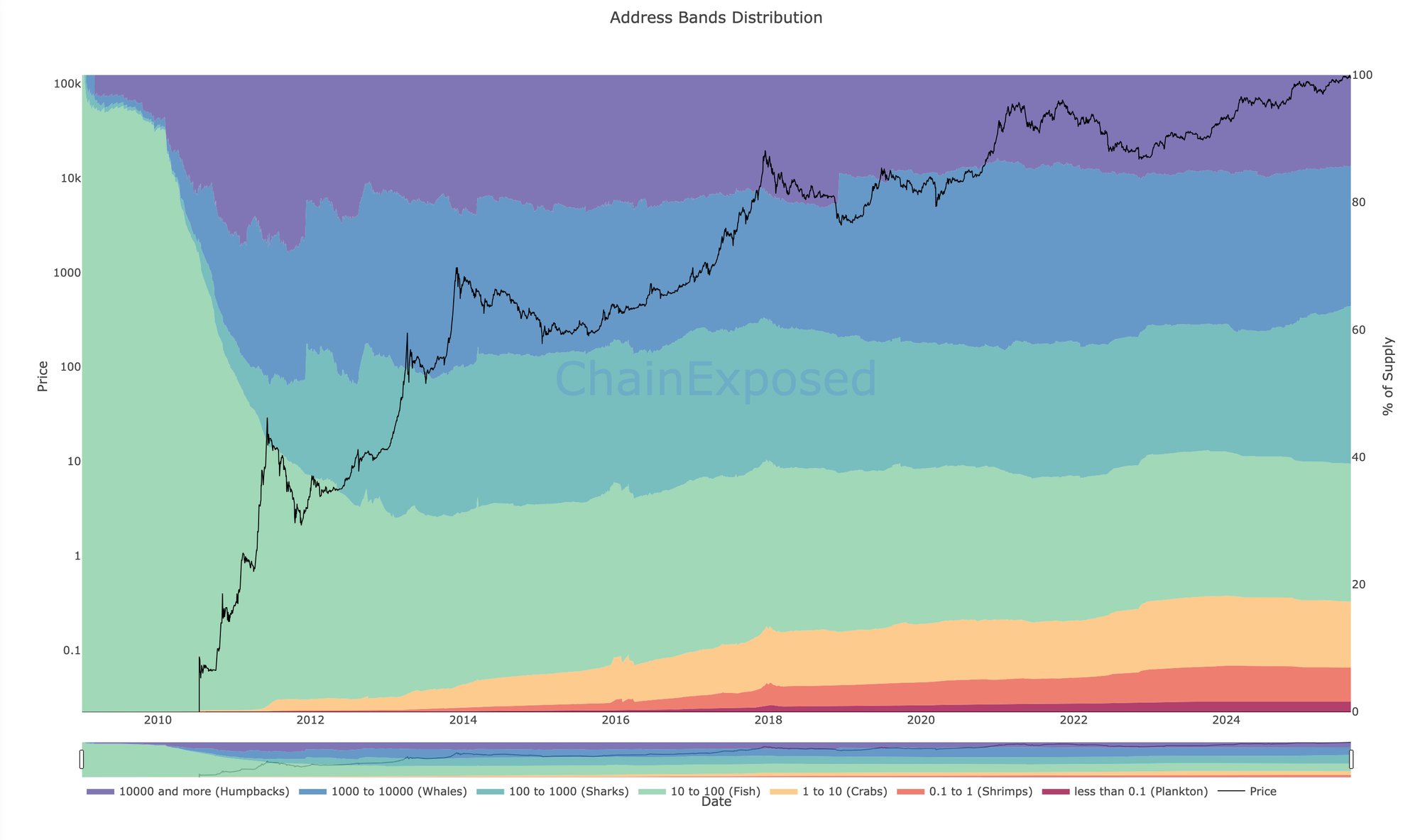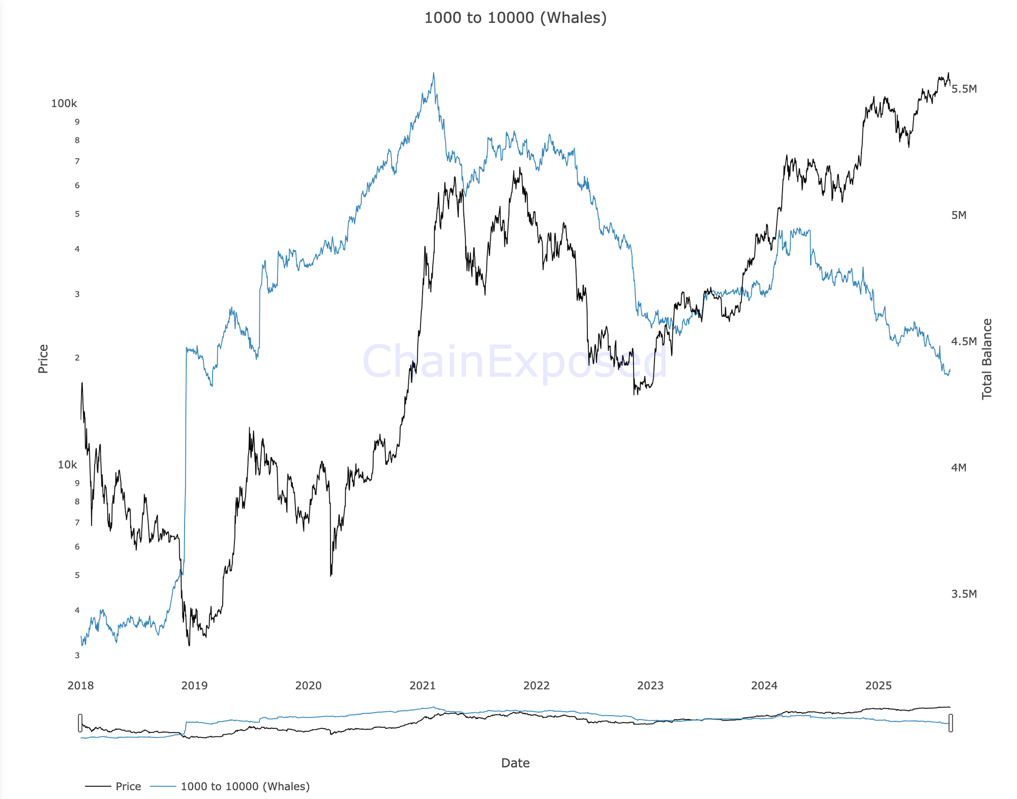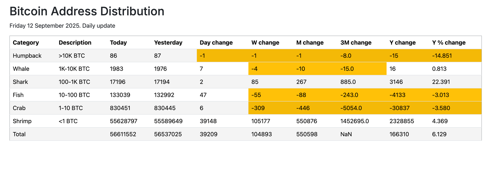 The whale band’s balance can drift down even in uptrends… distribution into strength, treasury moves, or coins migrating to ETF custodians. Treat step changes with caution and confirm with venue flows.