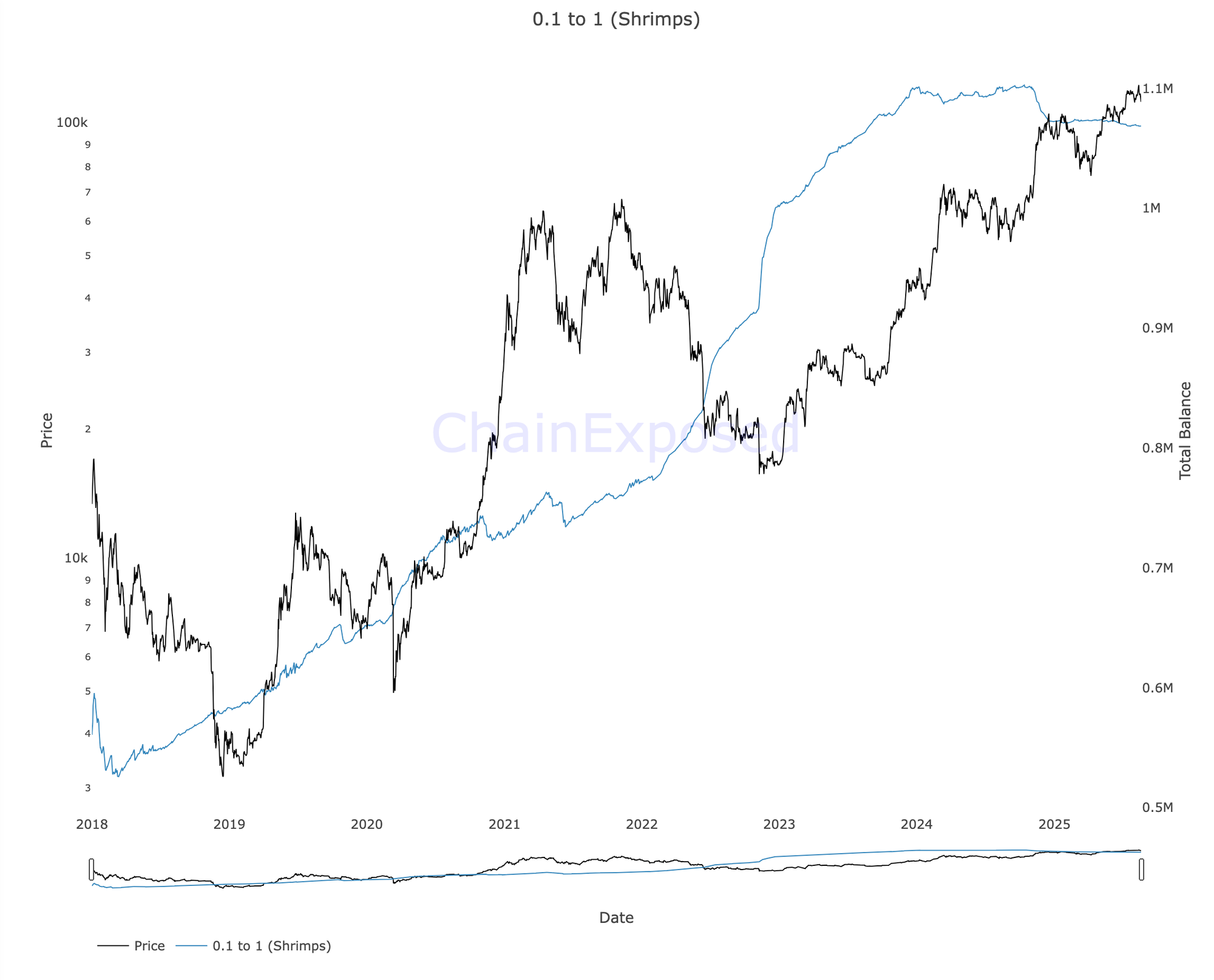 The light-blue line tracks the aggregate shrimps’ balance. A steady climb indicates continuing retail stacking… a flattening after a surge suggests digestion rather than an immediate reversal.
