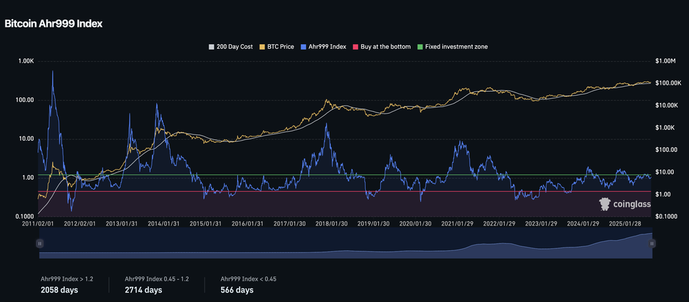 AHR999 is a long-horizon valuation index built from Bitcoin's price relative to its 200-day moving average. Instead of giving you a single ratio to interpret in isolation, it groups that relationship into three zones that correspond to deep value conditions, a neutral fixed-investment band, and a hotter region near cycle extremes.