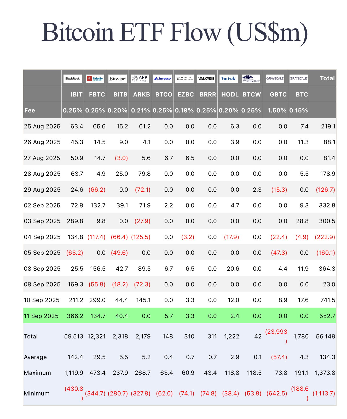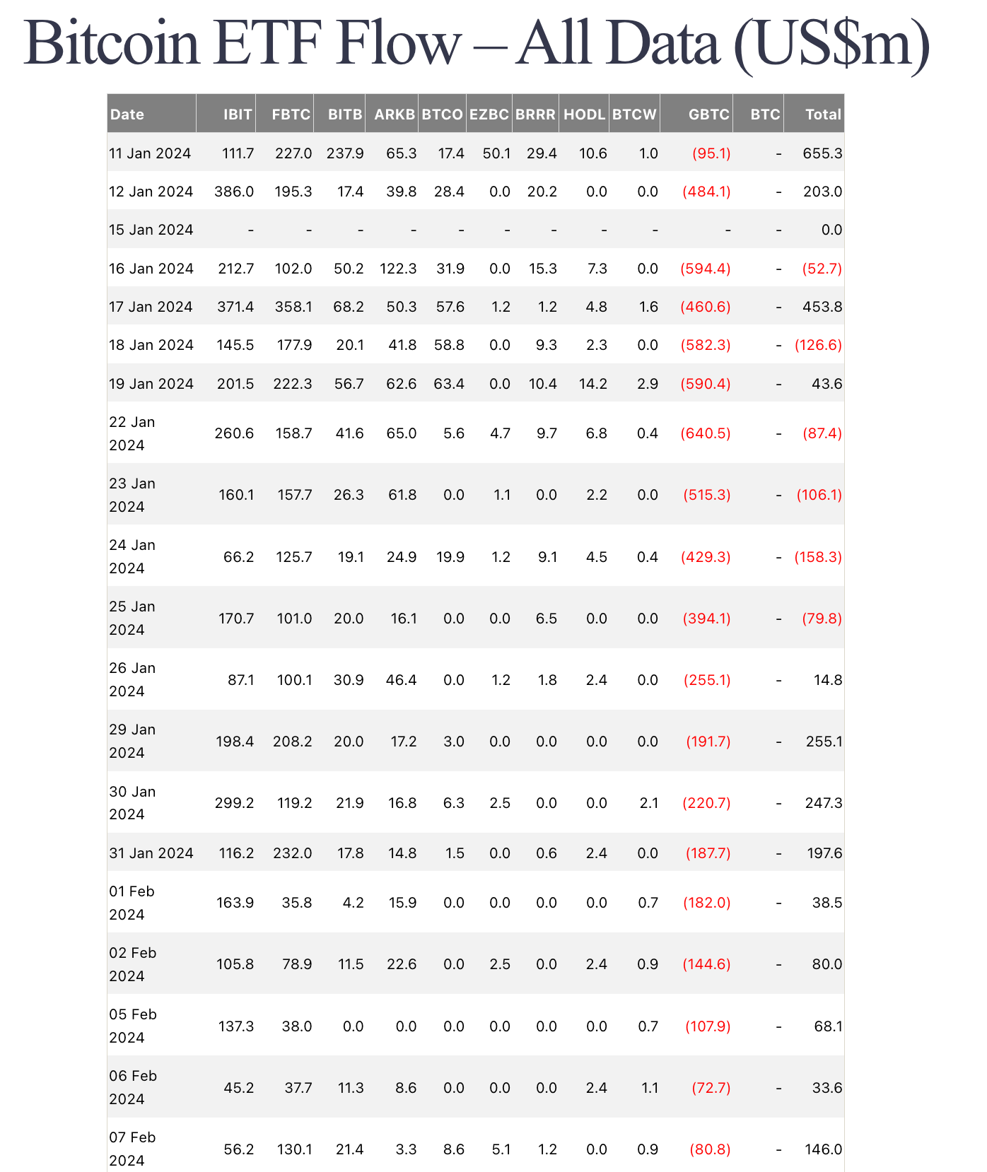 Daily creations and redemptions by fund. Use the Total column to gauge aggregate demand… then look for persistence over several sessions rather than a single big print.