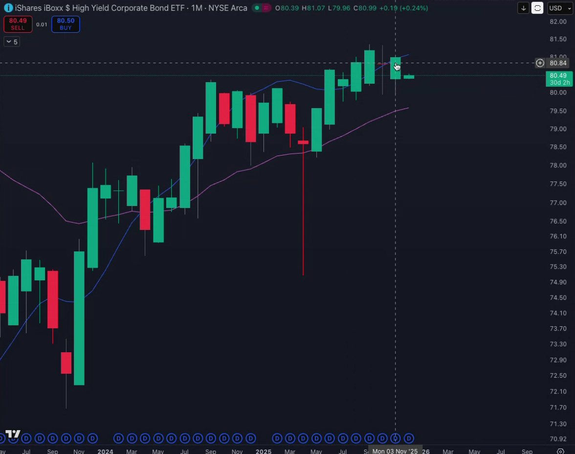 A decisive deterioration in HY credit alongside a break of around 73k would force a reassessment toward an ABC extension. Until then, weakness looks like base-building.