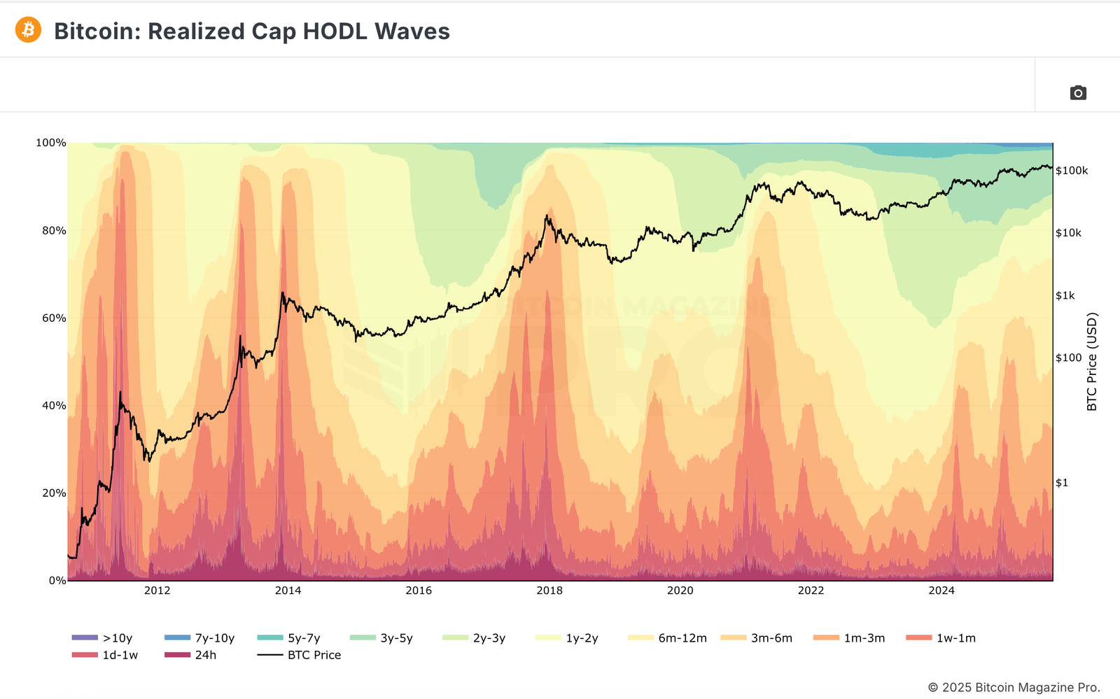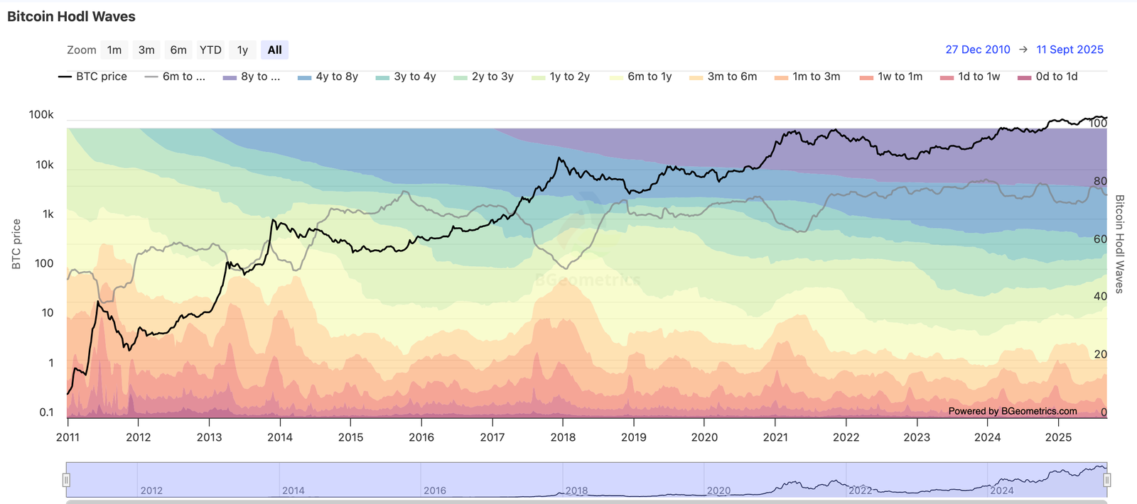 - HODL Waves show the percentage of Bitcoin supply that last moved within each age band, from very recent to many years old.