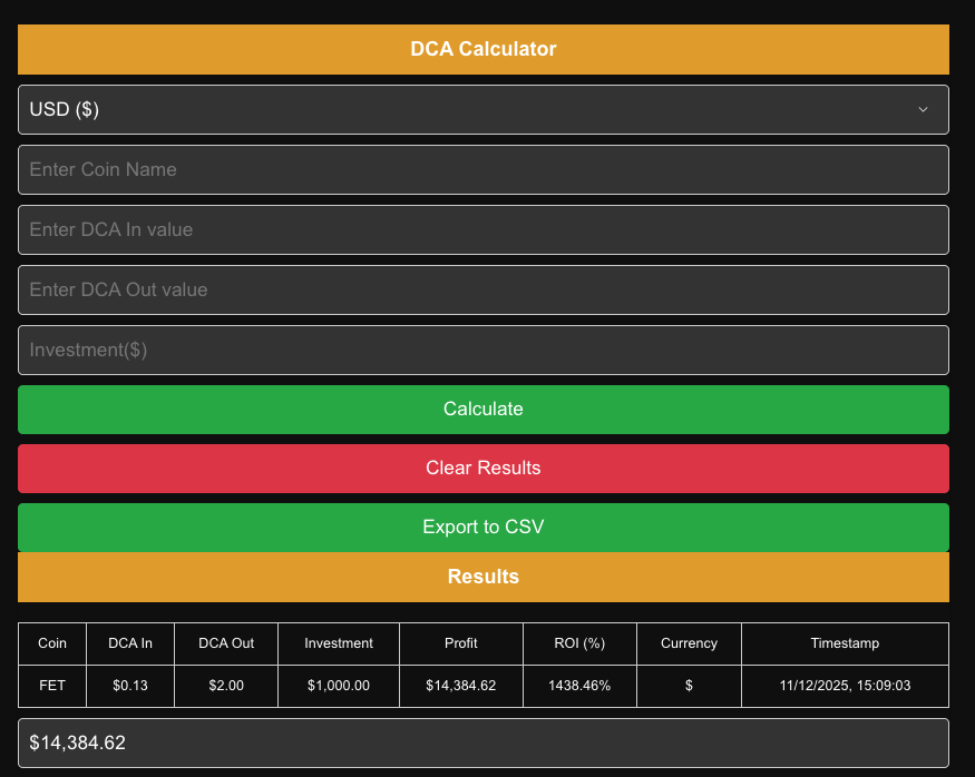 The tool lets you select any coin and currency, enter a set of DCA in and DCA out levels, and instantly see your total cost, average price and potential profit before you risk capital.