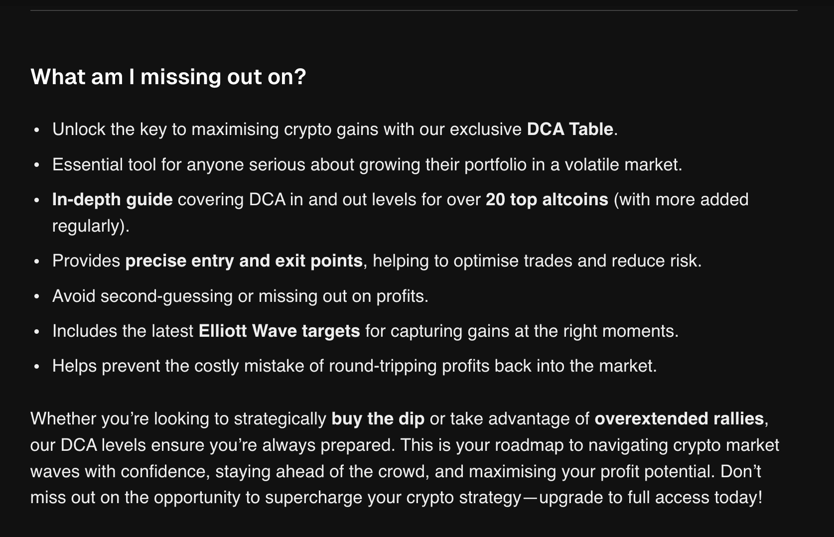 Inside Alpha Insider, we don’t guess. We publish the table: over 40 altcoins, each with precision DCA zones, profit-taking levels, and behavioural tags.