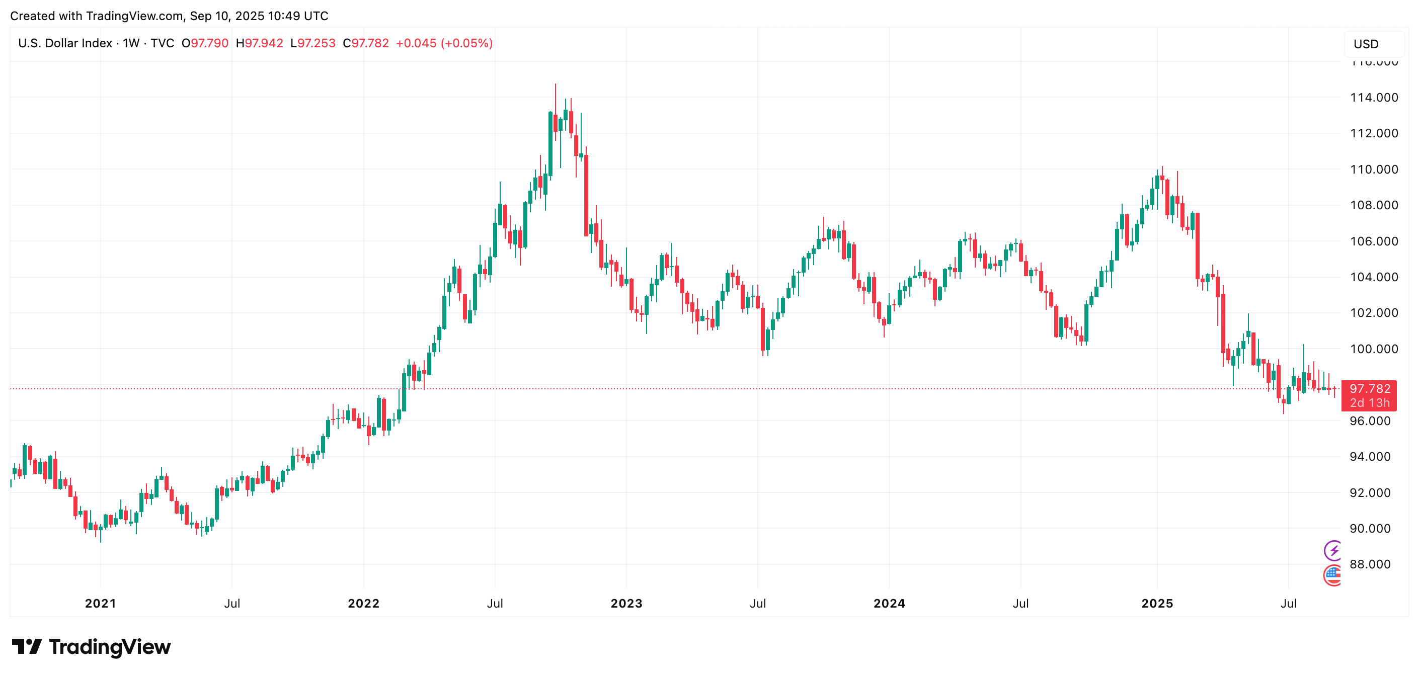 DXY’s weekly candles give the trader’s lens… structure, levels, and momentum that the broad index can’t show intraday.