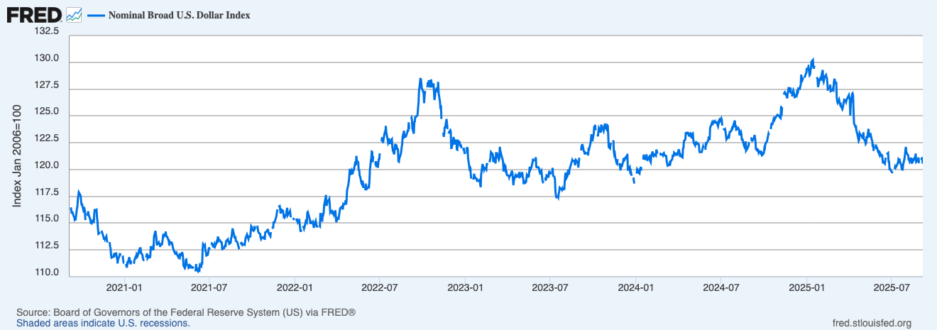 - Broad Dollar Index (DTWEXBGS) covers a wider set of trading partners… better for a global read.