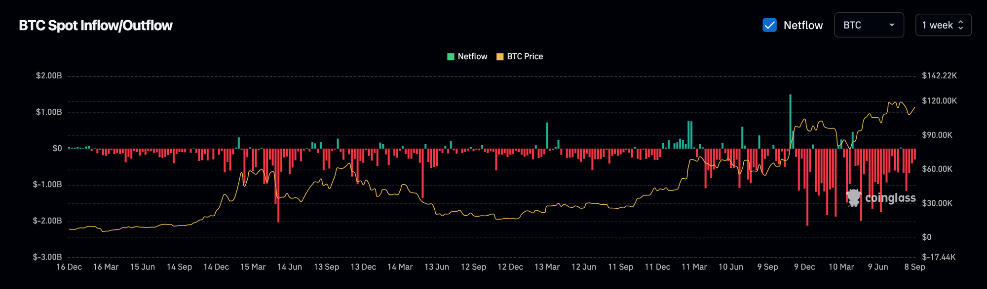 Green bars represent net inflows and red bars represent net outflows, with Bitcoin price shown on the same chart for context. Sustained inflows can indicate sell-side availability building on venues, while sustained outflows can indicate coins moving into custody and a thinner on-exchange float.