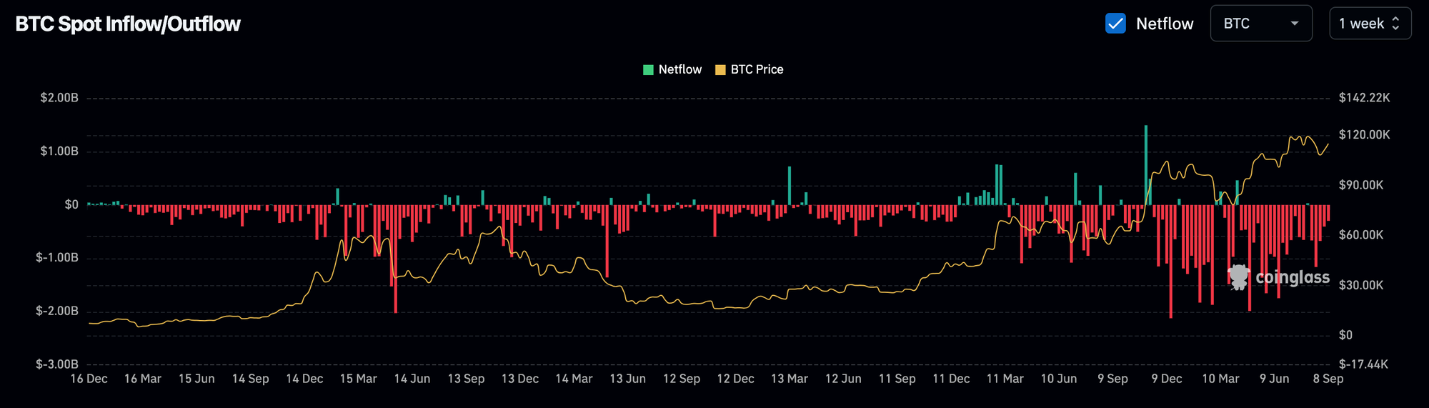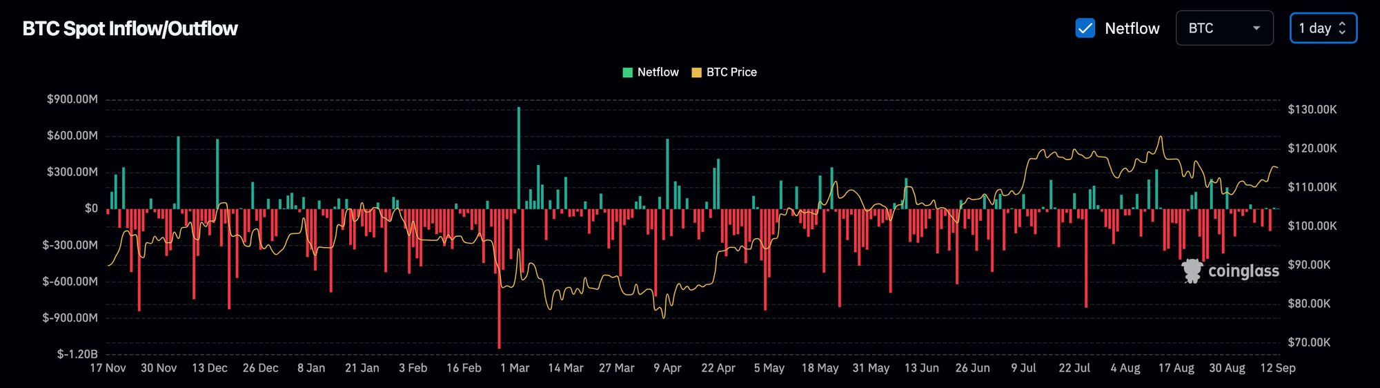 - Negative netflow: more BTC moved out to custody or elsewhere.