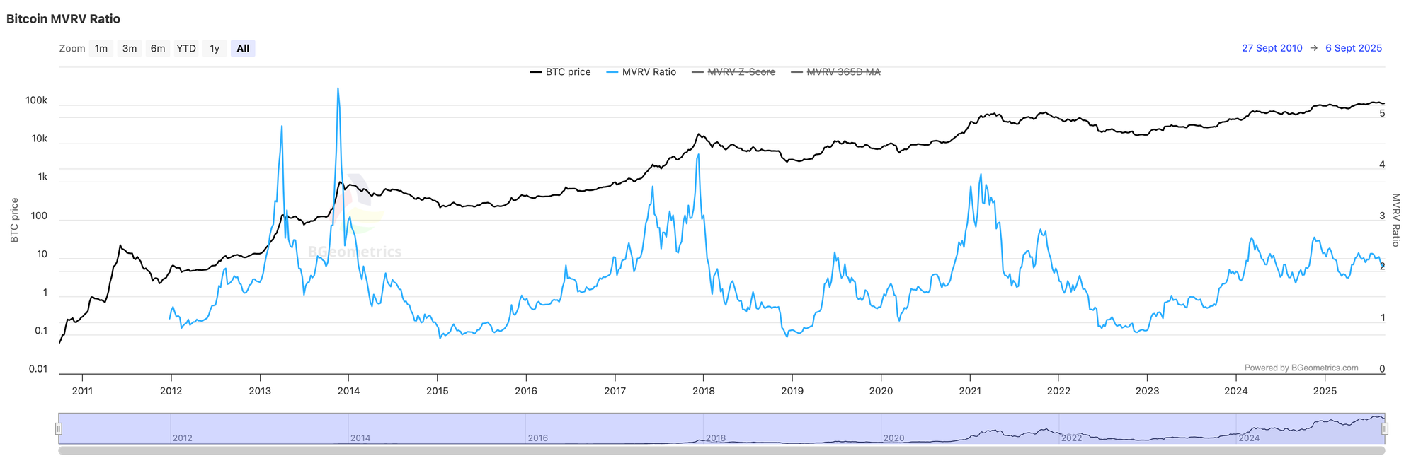 This chart shows the MVRV Ratio across cycles and helps contextualise typical risk zones.