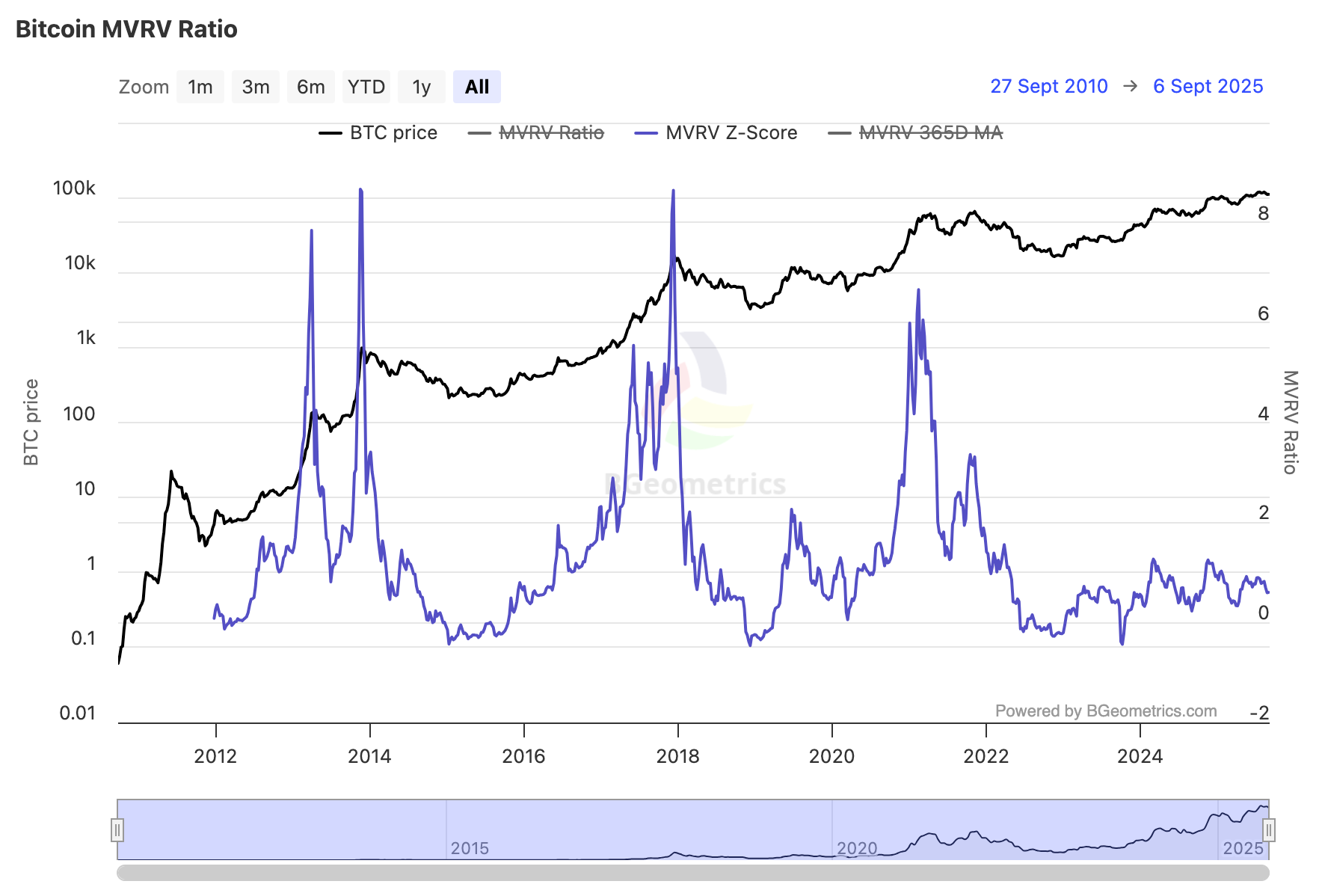 No. MVRV is the raw ratio. Z-Score normalises the Market Cap vs Realised Cap gap to highlight statistically unusual extremes.