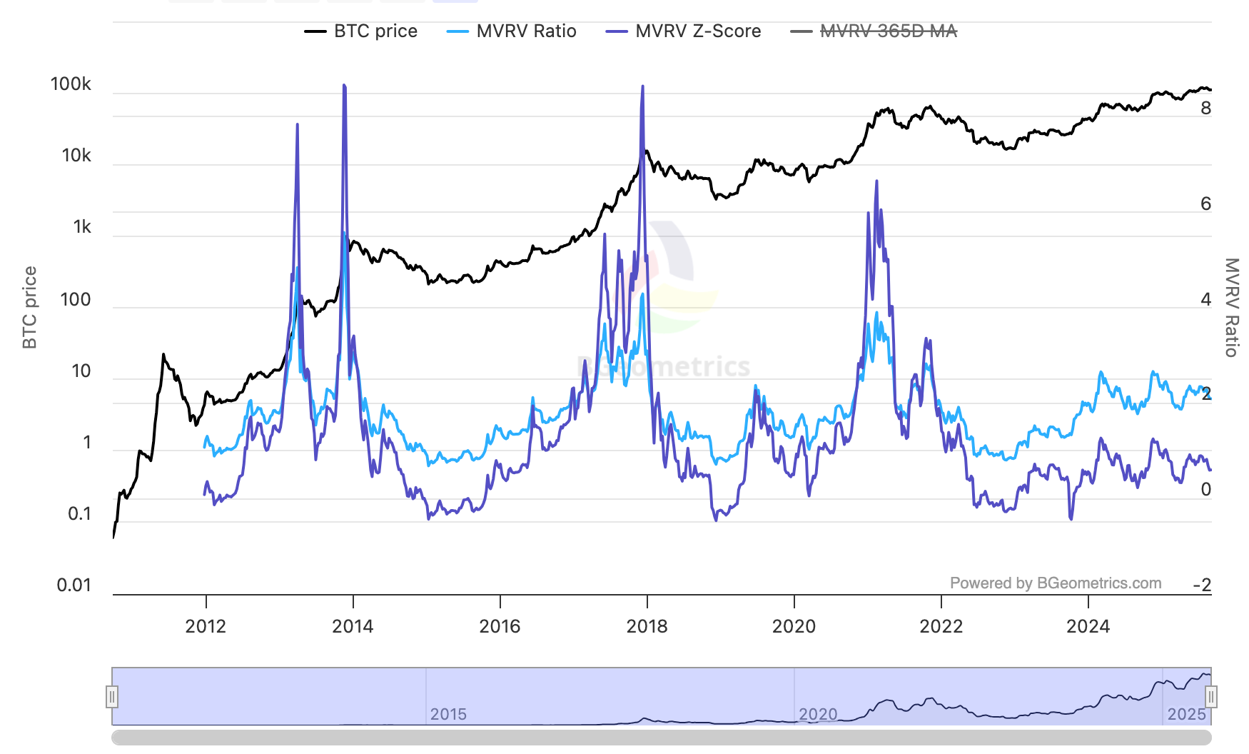 MVRV compares Market Cap to Realised Cap. Z-Score normalises that gap to historical variability, which helps compare extremes across cycles.