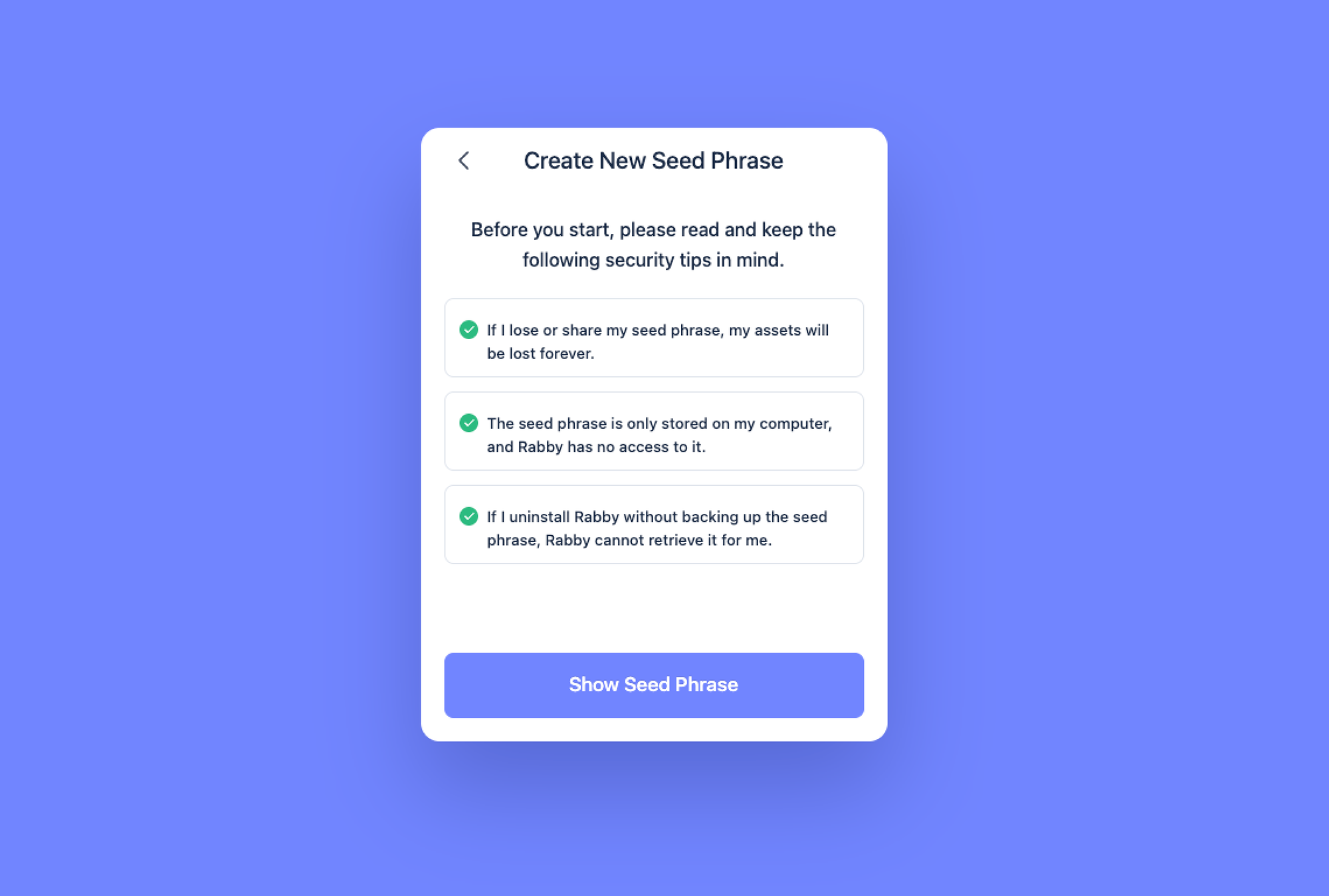 Rabby will show a short checklist before revealing your seed phrase. Take it seriously. If you lose your seed phrase, you lose access to the wallet permanently — Rabby cannot recover it for you.