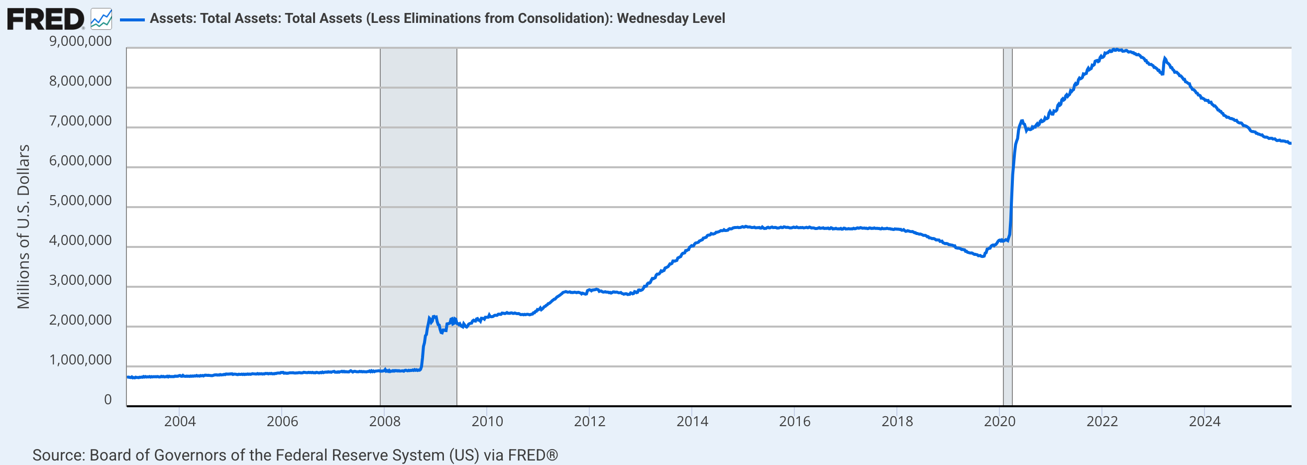 Large step-ups map to QE waves, declines to QT… use the slope and persistence, not one week’s wiggle. Shaded areas indicate U.S. recessions.