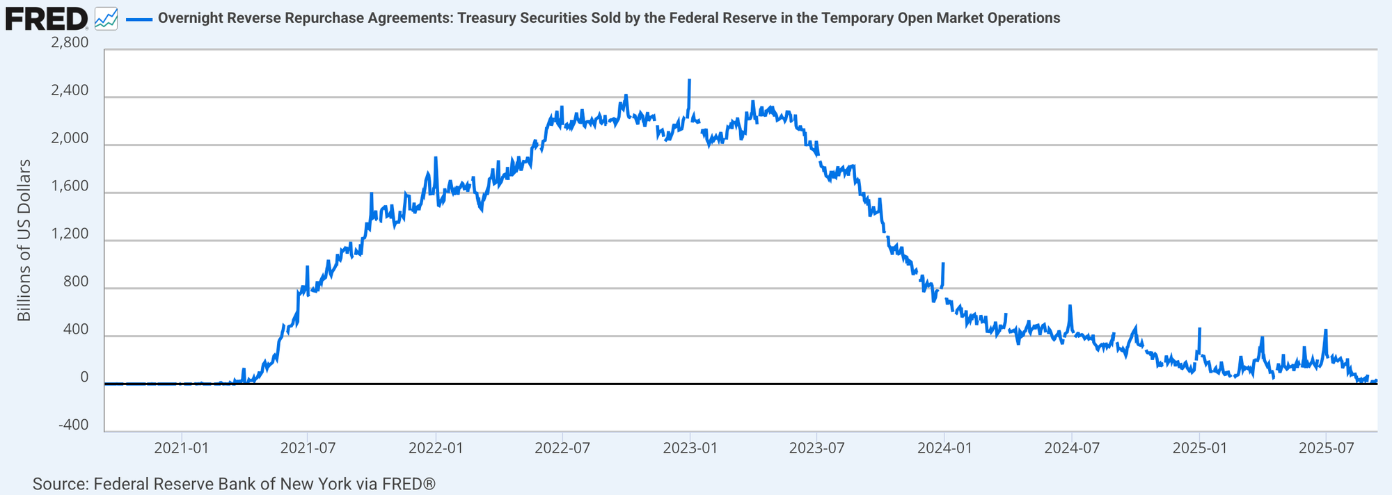 The 2021–2023 surge reflected abundant cash and scarce collateral… the subsequent slide released liquidity back into markets. Shaded areas indicate U.S. recessions.
