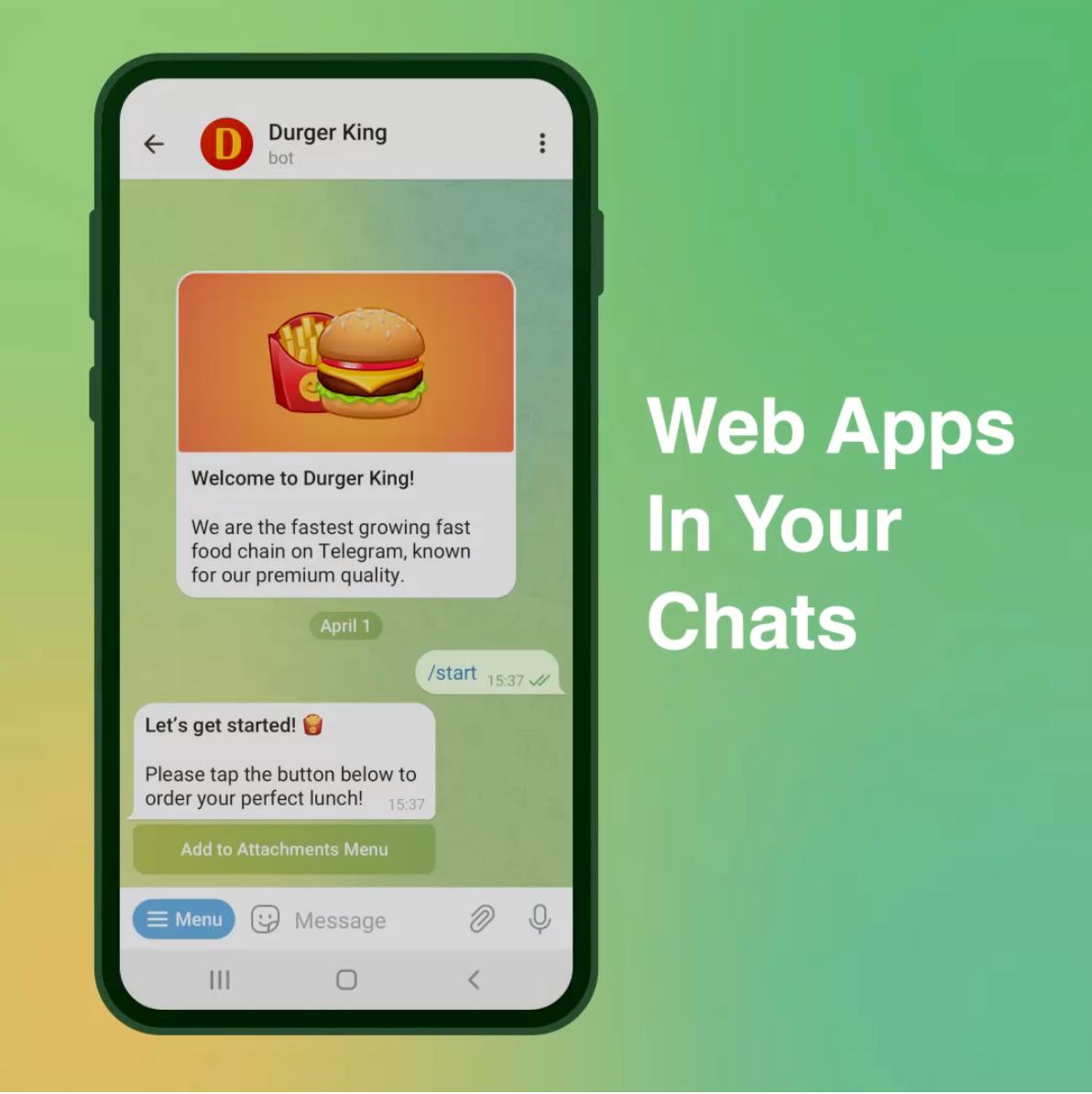 Mini Apps open full‑screen inside Telegram… perfect for ordering, gaming, and payments.