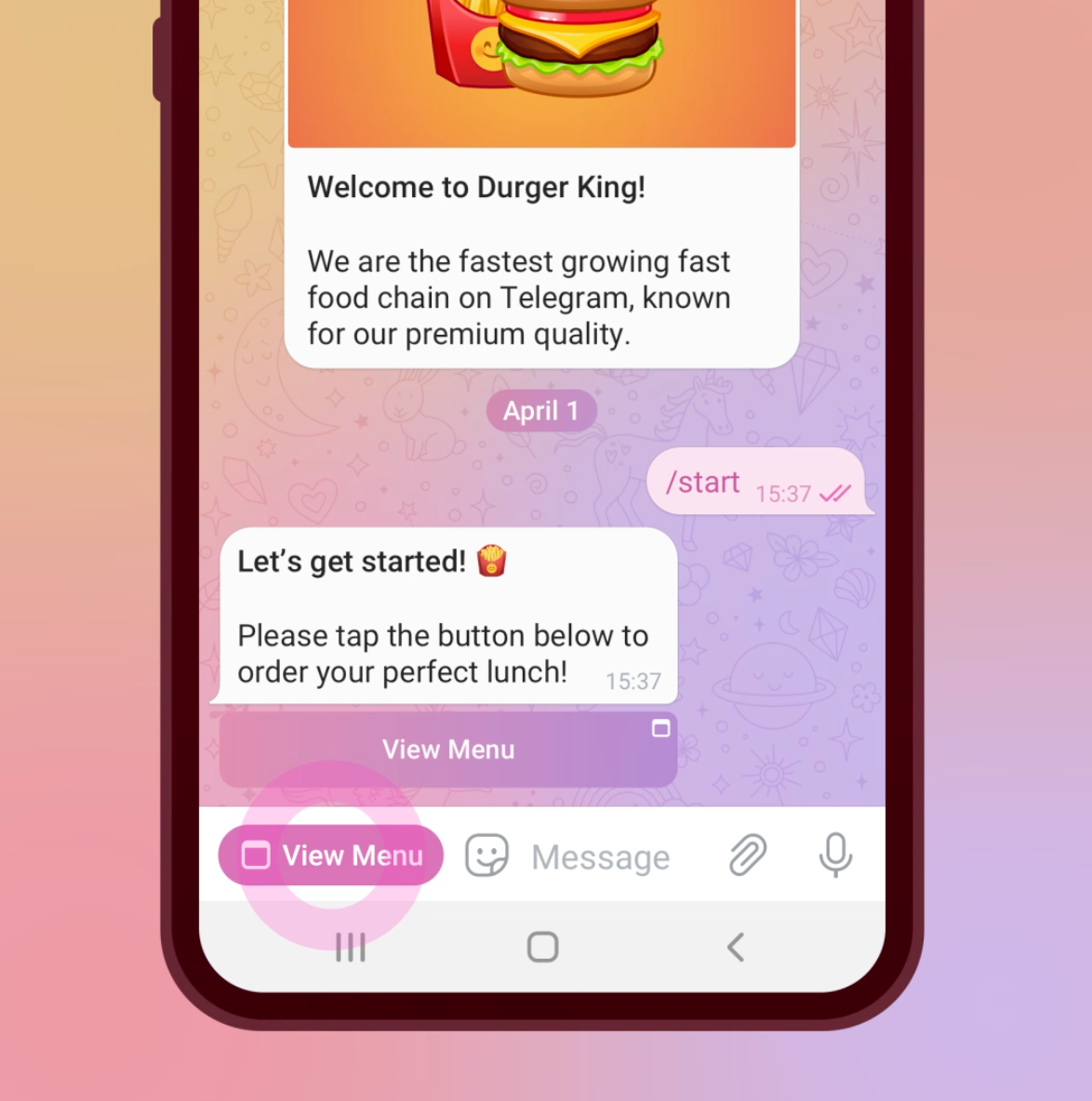 In a chat, Mini Apps appear via buttons like “View Menu”… tap to launch the app without leaving Telegram.