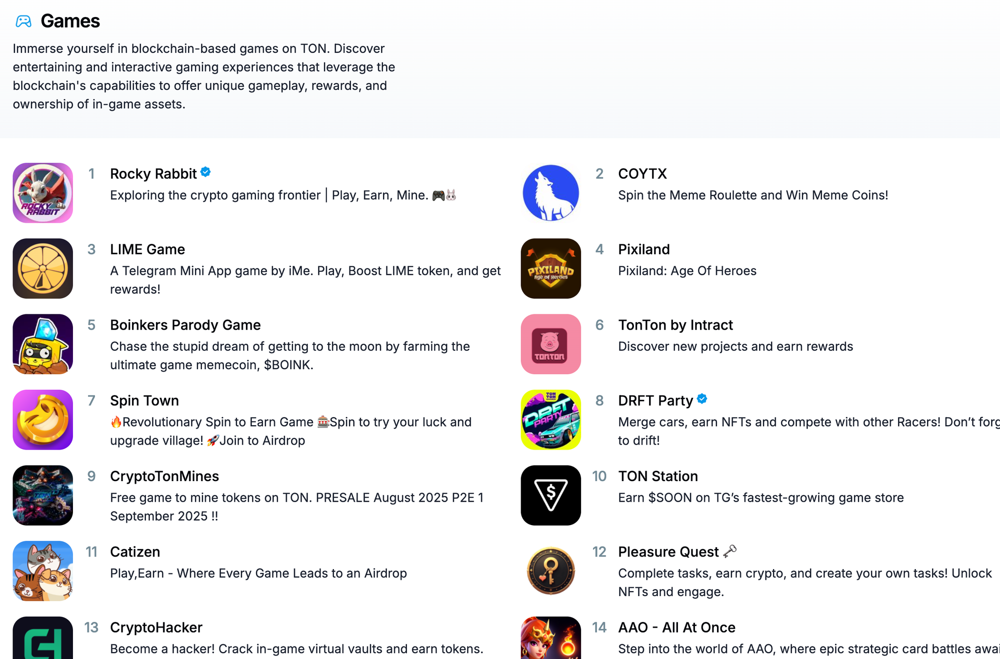 This gallery shows live Mini App games on TON… open a listing, then launch the Mini App from Telegram.
