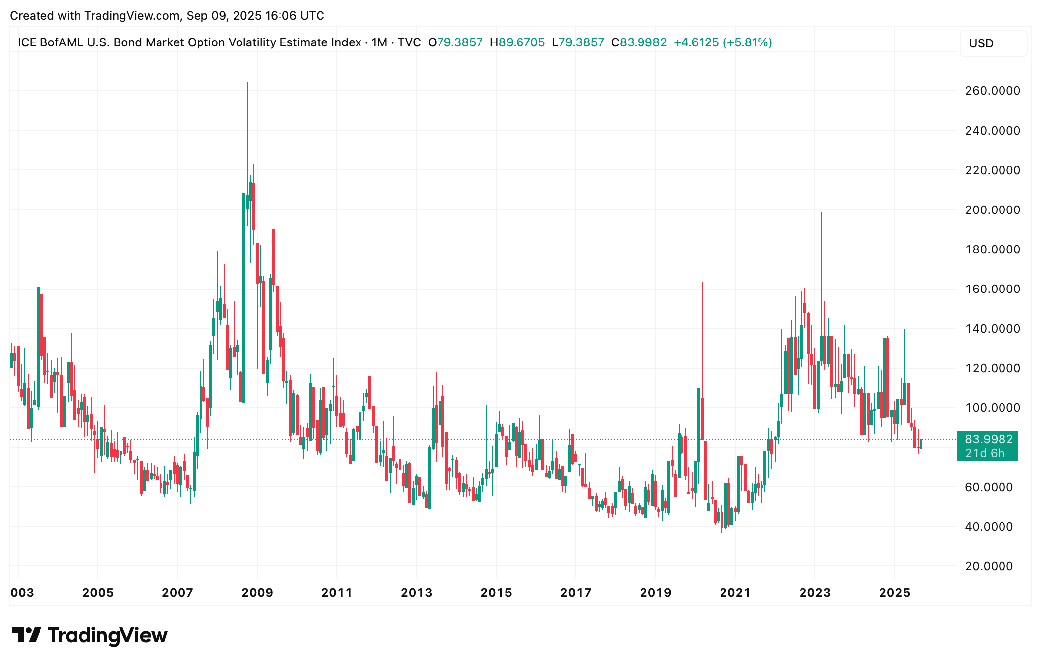 Bond-vol history with the 2022–23 rates shock, then a slow cool. Elevated MOVE with a calm VIX has often meant hidden tightness under the surface.
