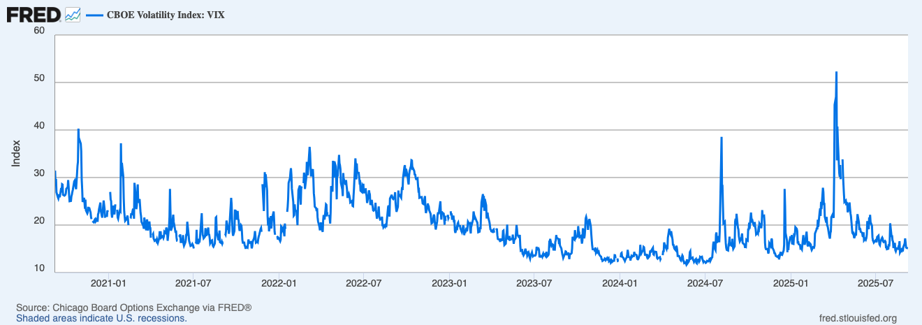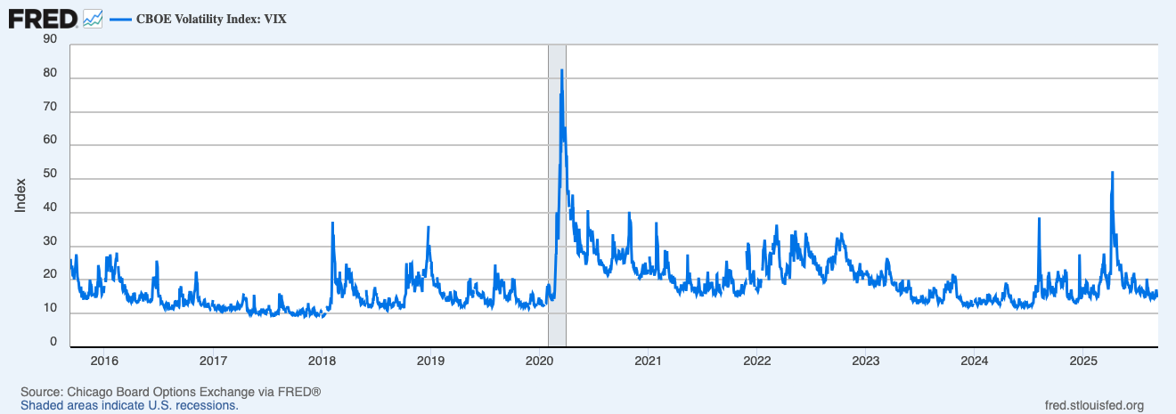 A decade of equity vol with the pandemic spike, post-2022 chop, and the low-vol regime that keeps getting punctured by data days.