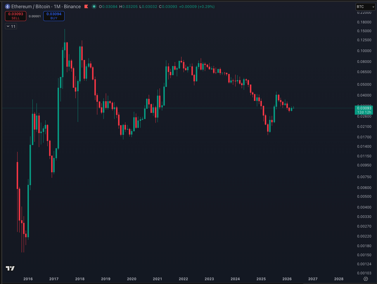 This chart measures Ethereum’s performance relative to Bitcoin, rather than in dollars. If ETH/BTC starts rising with conviction, it often signals improving appetite for alt exposure.