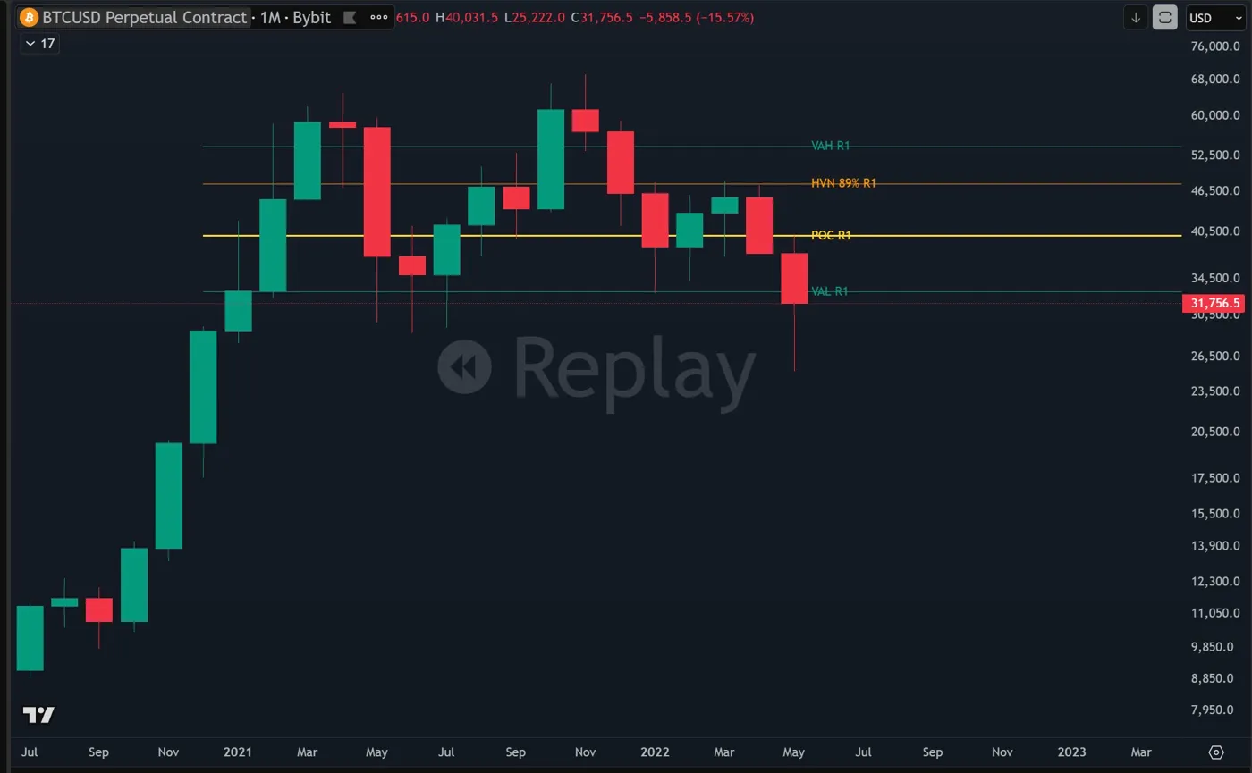 In 2022 Bitcoin was closing monthly candles below volume nodes and those nodes were becoming resistance on bounces. Price was breaking through value area boundaries decisively and not recovering. The VAL, the POC, the HVNs — each one fell and stayed fallen.