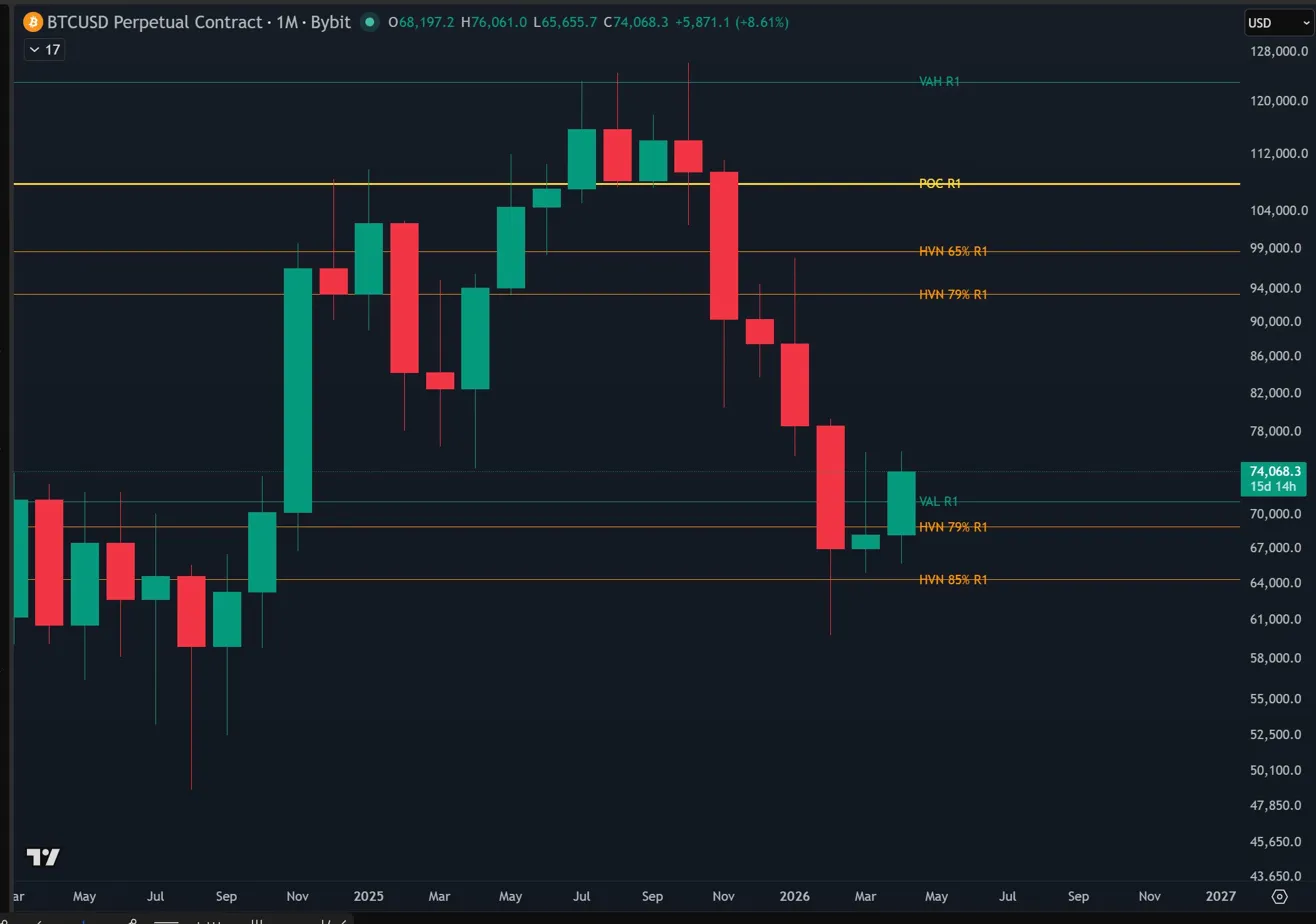 The monthly close told a completely different story. March closed at approximately $67,000, recovering back above the HVN 85% at $64,000. The close sits between the HVN 85% at $64,000 and the HVN 79% lower at $68,000, outside the value area but above the critical 85% level.